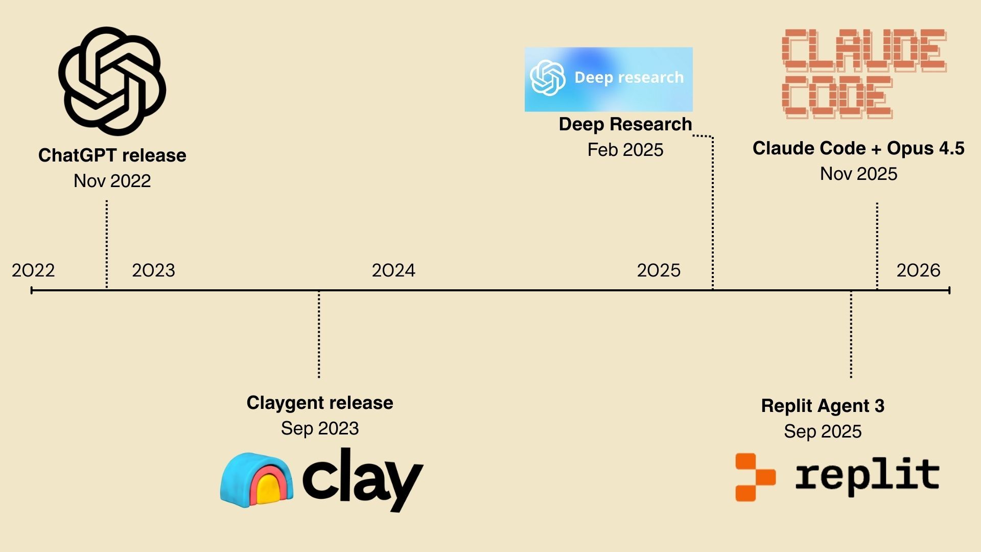 A timeline of the five AI breakthroughs that reshaped how we build and run go-to-market systems — from ChatGPT to Claude Code.